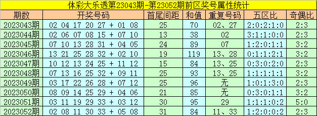 上期回顾:体彩大乐透第2023052期开出奖号:02 08 11 30 33 + 05 08,前区奖号首尾间距为31,和值为84,五区比为1:2:0:0:2,奇偶比为2:3。