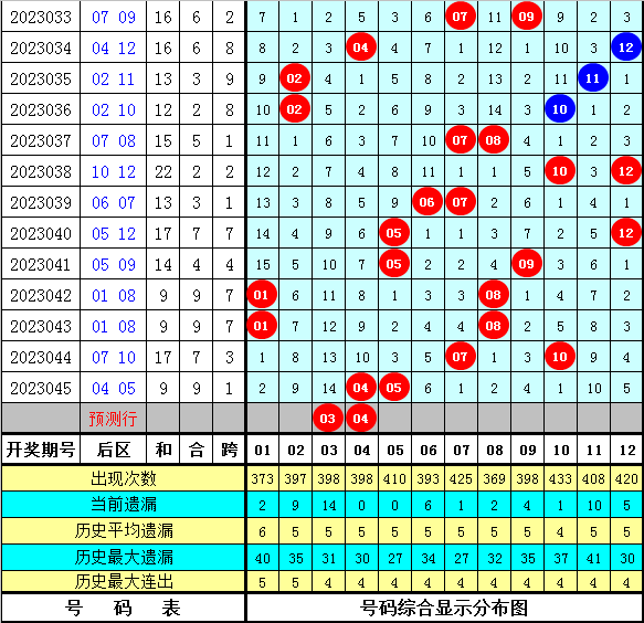 后区上期开出奖号:04+05,前6次后区奖号04+05出现之后,其下期分别开出号码:08+10、01+10、08+09、05+11、03+07、06+12,本期后区注意五码03 04 08 12,单挑两码03 04。