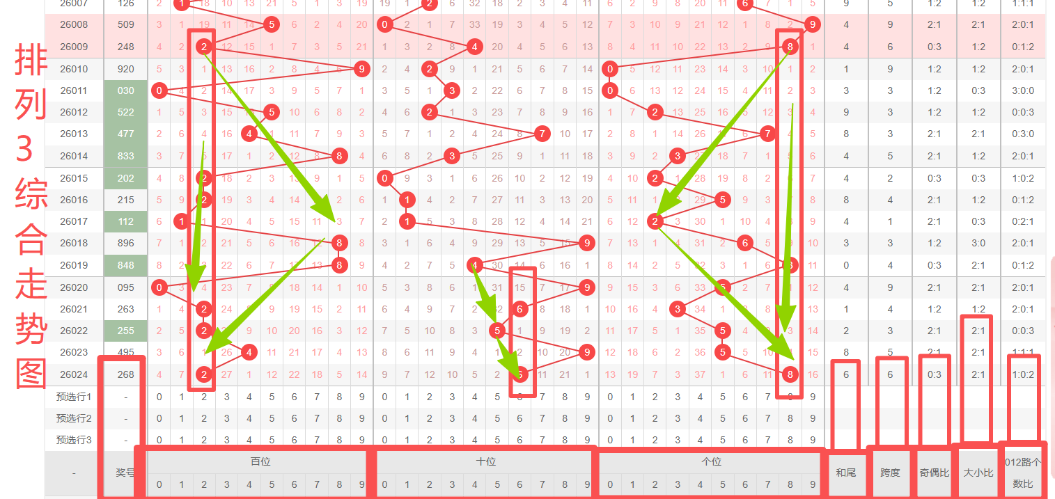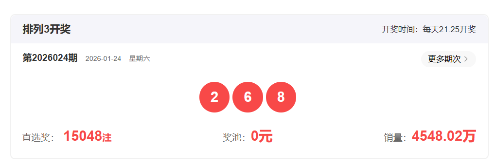 体彩排列3第2026024开奖号码268,形态为组六,奇偶比0:3,和值16,跨度6,大小比2:1,【012】路个数比1:0:2。
