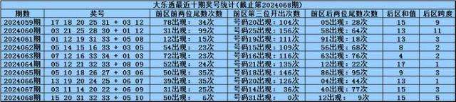 体彩大乐透第2024068期奖号为:15 20 31 32 33+05 10,前区号码大小比开出4:1,012路比开出2:1:2,奇偶比开出3:2,后区号码和值开出15,跨度开出5。