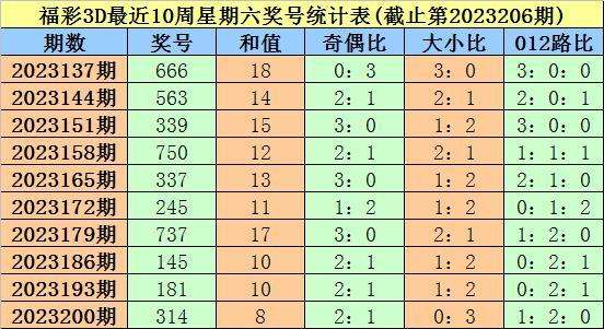 福彩3D第2023200期(上周星期六)奖号为314。其中奖号奇偶比为2:1,大小比为0:3,012路比为1:2:0。