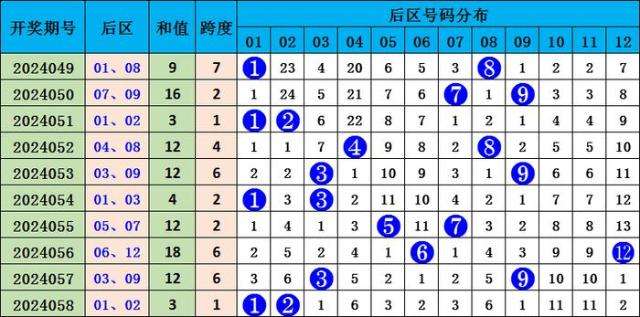 后区开出号码01、02,和值3,近10期和值都在3-18之间,预计下期和值出现在10-15。近10期,跨度在1-7之间,第1位波动范围1-7,第二位波动范围2-12。预计下期跨度3-7。后区推荐号码04、09