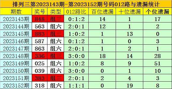 开奖回顾:排列三第2023152期奖号为:318,类型为组六,号码012路比为1:1:1,百十个位号码直选分别遗漏0期、19期和8期。