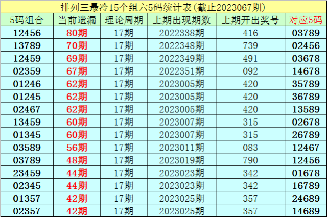 (4)排列三第2023067期遗漏值最大的十个5码组六组合解冻了0个;