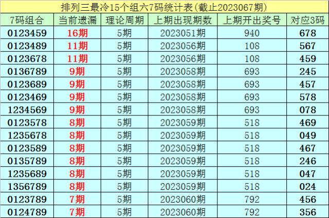 (1)在排列三已开出的6488期奖号中(统计截止第2023067期),目前7码组六遗漏值最大的组合为:0123459,本期遗漏16期;