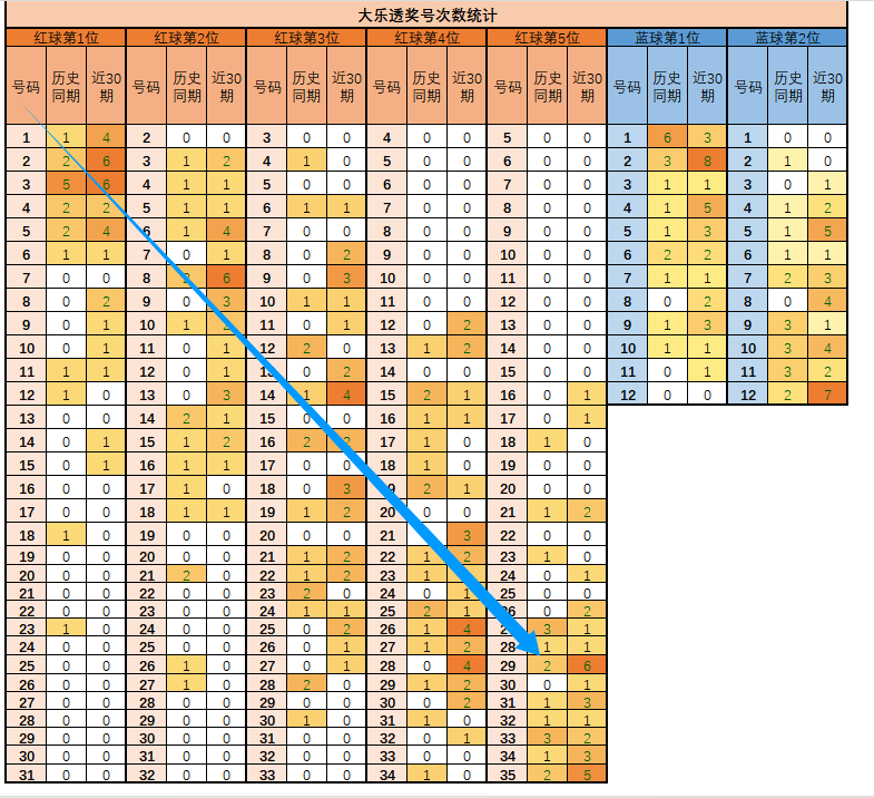 1、如上图,背景越深色,说明出号频率越高。