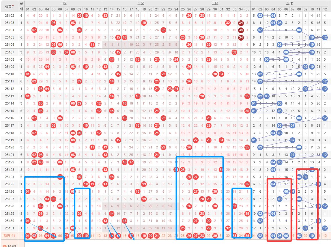 先回顾上期,特征:奇偶比3:2,区间比是2:0:3,质合比为1:4,1个红球重号,0组连号,0个邻号,4个孤号,蓝球大大组合,奇数偶数组合。