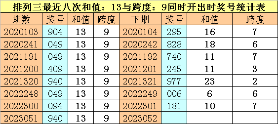 体彩排列三最近八次同时出现和值:13与跨度:9的奖号分别为:904、049、049、409、940、049、094、940,前七次下期开出奖号分别为:295、828、740、245、977、006、181,详见下表:
