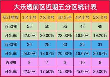 近50期,一区出号55个,二区出号50个,三区出号55个,四分区出号42个,五分区出号48个。五区数据对比中,1分区出号较多。