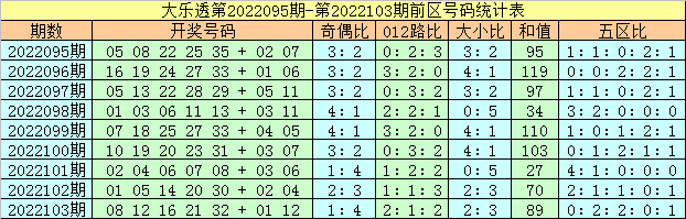 1、前区五区分析:最近9期前区五区比为12:9:8:9:7,上期奖号五区比为0:2:2:0:1,第二、三区大热,第一、四区断区,本期预计第四、五区号码大热,防第一、三区号码全部轮空,参考五区比0:1:0:2:2。