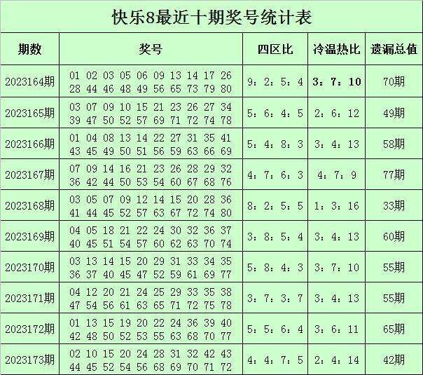 福彩快乐8第2023173期开奖回顾:02 10 15 20 24 28 31 32 42 43 44 45 52 54 56 68 69 70 71 72,其中奖号四区比为4:4:7:5,冷温热码比为2:4:14,遗漏总值为42。