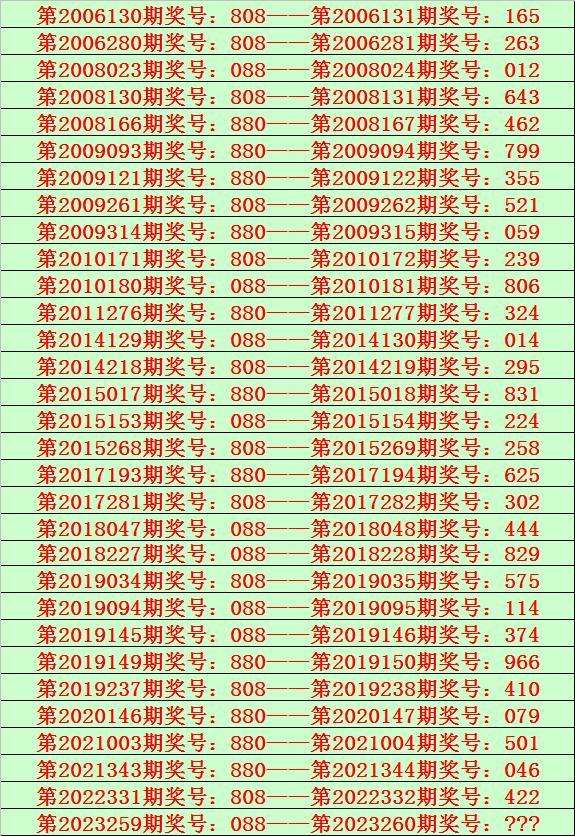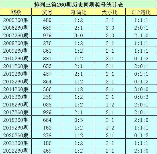 排列三第2023260期开奖日期:2023年9月27日,历史上第260期已开出了18次奖号,历年同期号码分别为:489、659、979、276、861、881、653、457、854、366、258、038、929、664、162、278、186、469。