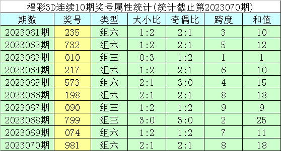 开奖回顾:福彩3D第2023070期奖号为981。奖号形态为组六,大小形态为大大小,奇偶形态为奇偶奇,和值为18,跨度为8。