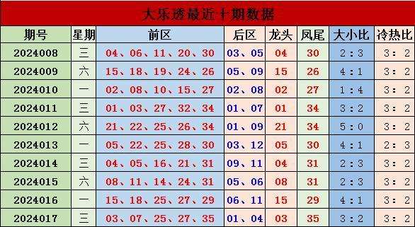 上期回顾,大乐透第2024017开奖,本期奖号:前区03 07 25 27 35;后区01 04,当期前区号码大小比为3:2,三区比2:0:3,奇偶比5:0。前区开出连号,未开出重号25 27。
