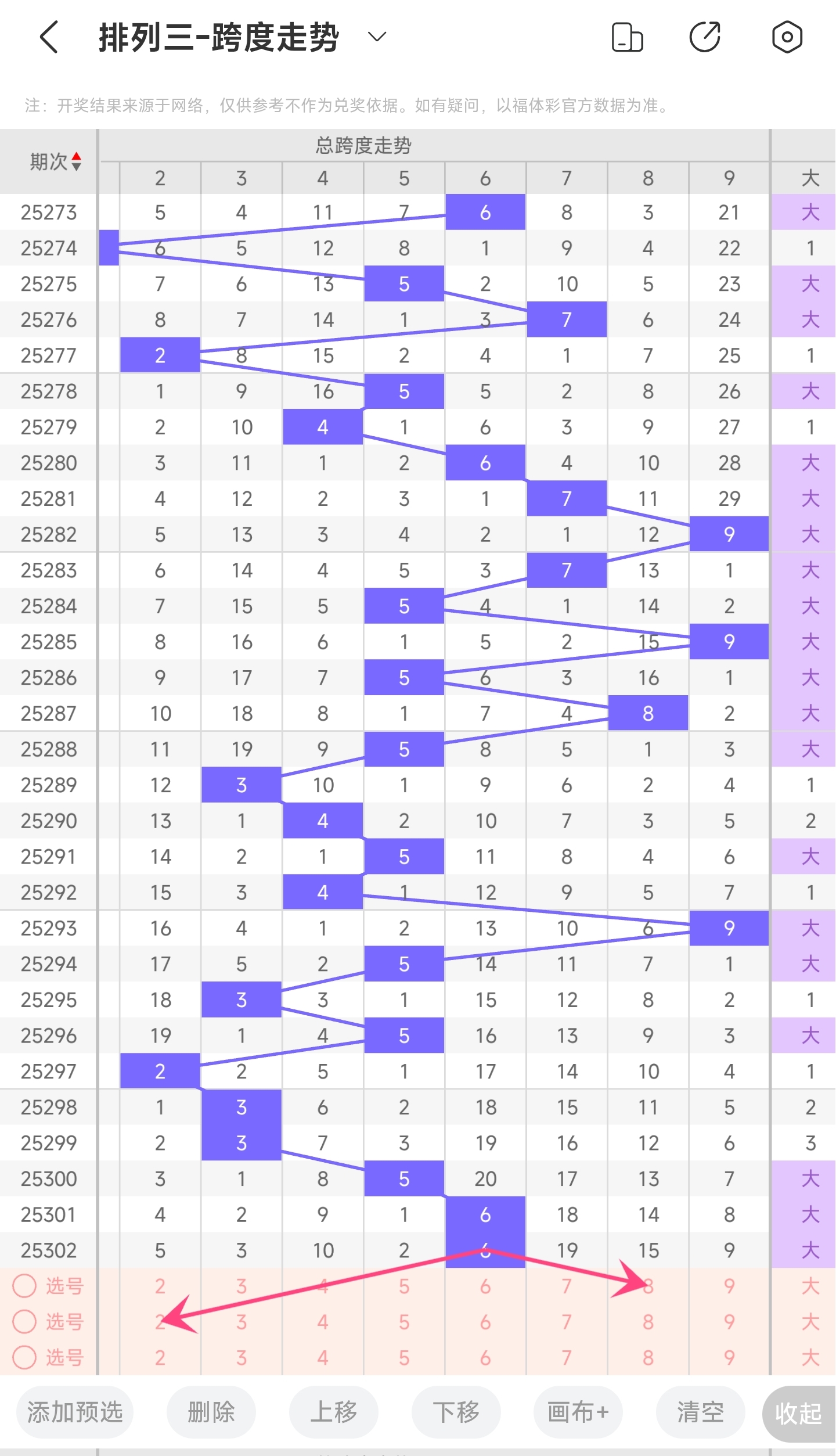 上期跨度为6,往前一期跨度是6,趋势没有移动,偏移量为0。跨度值6时,跨度值是近30期内开出中间位置的值。通过走势图分析,目前的趋势是可能往左也可能往右。所以推测本期跨度可能为23458等跨度。