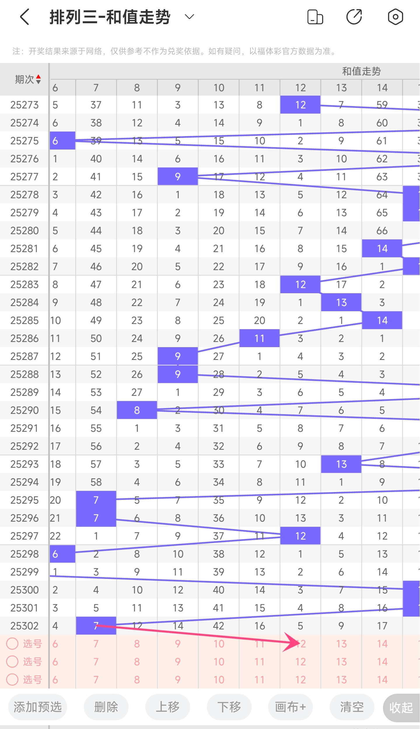 上期和值为7,往前一期和值为15,趋势往左移动,偏移量为8。通过走势图分析,7和值是近30期内开出的比较小的和值,上升空间比较大,下降空间很小。所以趋势是大概率往右,小概率继续左。本期看好大和值,因此推测本期趋势是往右的,和值会变大,小概率继续往左,和值变小。