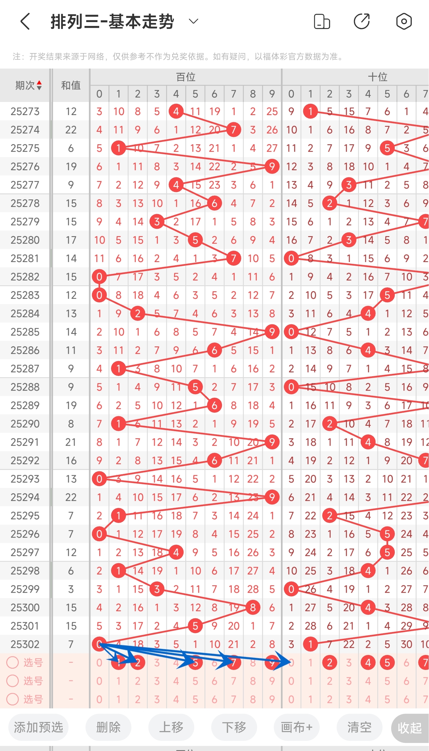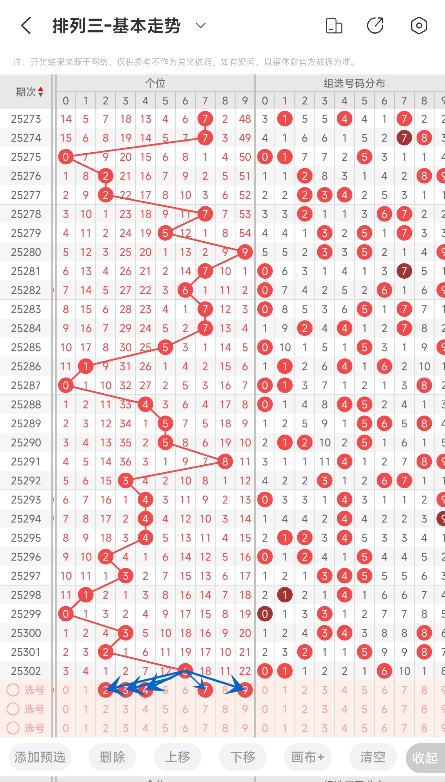 上期开出了0号球。往前一期开出的是5号球。趋势往左移动,偏移了5个点。通过走势图分析,可以看到目前趋势是比较明显往右的了。上期偏移量是增大了,结合近几期偏移量走势,有开大偏移量的趋势,所以本期我们主要关注中大偏移量的号码,然后再防一下小偏移量的号码。最后再结合遗漏期数和冷热号,本期我们可以关注1,2,5,7,9号球。综上所述本期我们推测可能开1,2,5,7,9等号码。