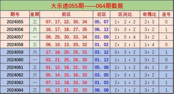大乐透24064期开奖,本期奖号:前区05、12、21、32、33后区08、09;当期前区号码三区比为2:1:2,奇偶比为3:2。形态方面,前区开出连号32、33;开出重号12、33。