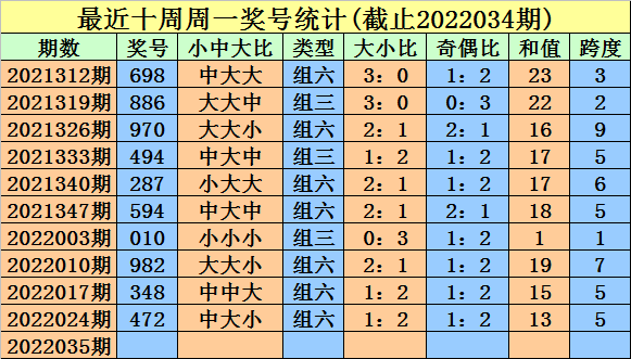 奖号类型判断:近期周一组六明显活跃,近十周开出7次,上周一为组六,组三出现较少,本周一看好在组六。