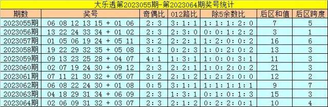 开奖回顾:体彩大乐透第23064期奖号开出:02 06 09 31 32+03 07,前区奖号和值为80,跨度为30,除5余数比为0:2:2:0:1,遗漏总值为10,后区奖号和值为10,跨度为4。