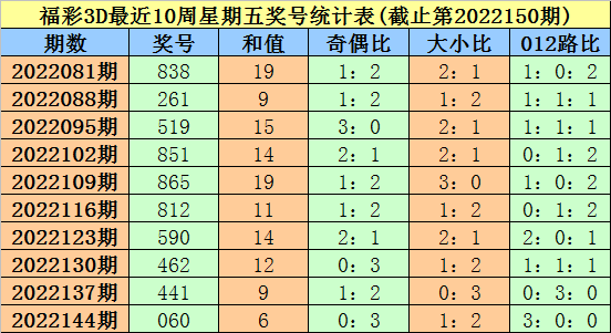 福彩3D第2022144期(上周星期五)奖号为060。其中奖号奇偶比为0:3,大小比为1:2,012路比为3:0:0。