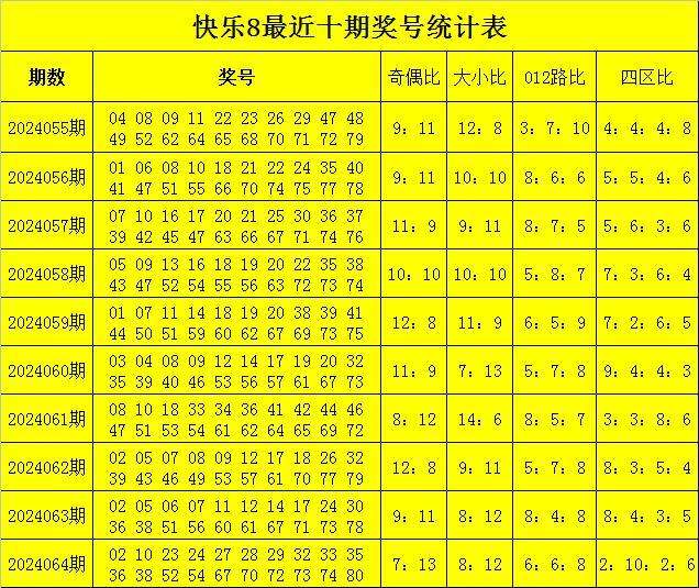 福彩快乐8第2024064期开奖回顾:02 10 23 24 27 28 29 32 33 35 36 38 52 54 67 70 72 73 74 80,其中奖号大小比为8:12,012路比为6:6:8,和值为859,跨度为78,奇偶比为7:13。