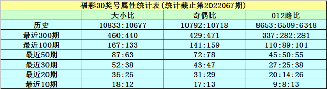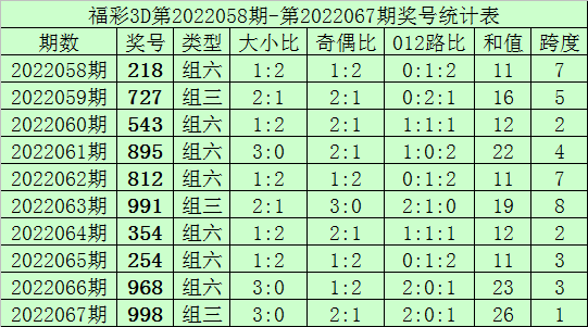 开奖回顾:福彩3D第2022067期奖号为998,其中奖号大小比为3:0,奇偶比为2:1,012路比为2:0:1,和值为26,跨度为1。
