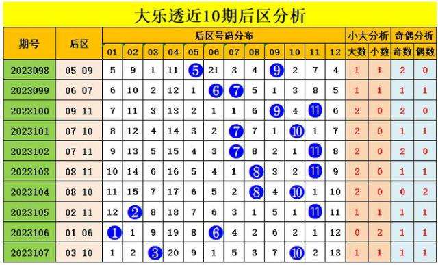 后区近10期大小比为14:6,大号码走势较热,上期开出小大组合,本期后区推荐小小组合;