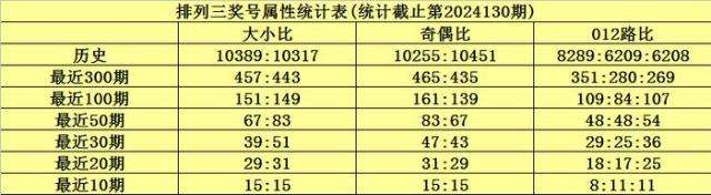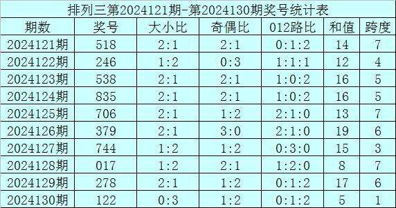 上期回顾:排列三第2024130期奖号为122,奖号012路比为0:1:2,奇偶比为1:2,大小比为0:3,和值为5,跨度为1。