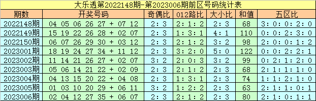上期回顾:大乐透第2023006期奖号为:02 04 12 27 35 + 06 07,其中前区奇偶比2:3,012路比2:1:2,大小比2:3,和值80,五区比2:1:0:1:1。