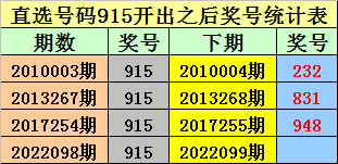 排列三直选915出现之后下期奖号分别为:232-831-948。