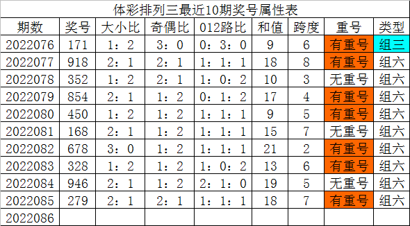 体彩排列三最近10期分别开出奖号:171、918、352、854、450、168、678、328、946、279,各奖号属性详见下表:
