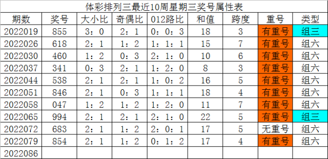 体彩排列三最近10周星期三奖号分别为:855、618、460、341、538、846、047、994、683、854,各奖号属性详见下表:
