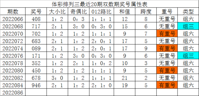 体彩排列三最近20期双数期奖号分别为:408、717、702、683、089、171、352、450、678、946,各期奖号详细属性下表: