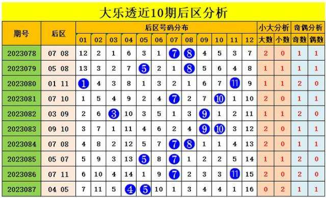 后区近10期大小比为14:6,大号码走势较热,上期开出小小组合,本期后区推荐小小组合;