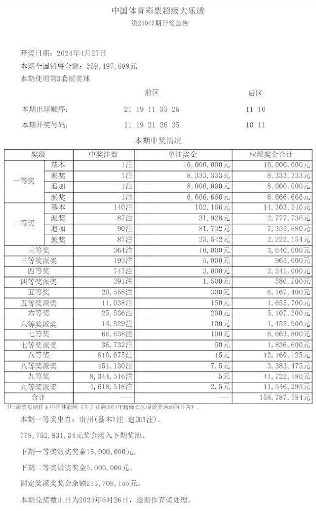 北京时间4月27日晚,体彩超级大乐透第24047期开奖,同时本期也是大乐透10亿大派奖的第18期。当期开奖号码为前区11 19 21 26 35,后区10 11。