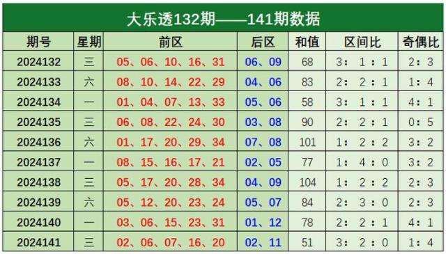 大乐透第2024141期出奖号统计:前区02、06、07、16、20,后区02、11。和值为51,区间比为3:2:0,奇偶比为1:4。