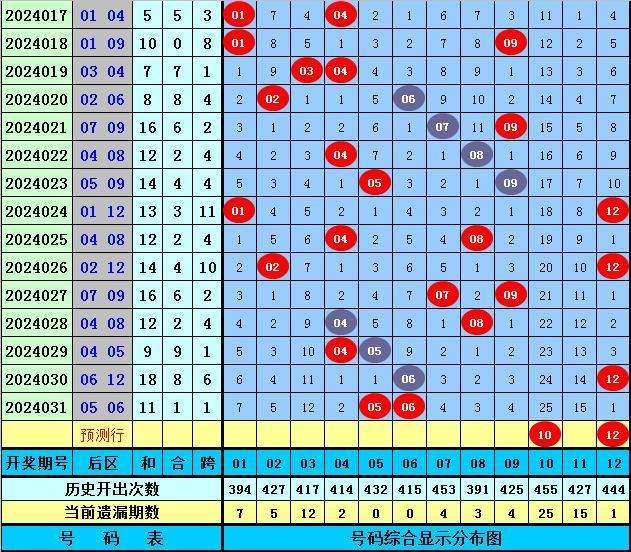 后区分析:上期后区奖号为05和06,最近5期后区和值分别为16、12、9、18、11,后区跨度分布范围在1-6,本期后区注意两码10、12。