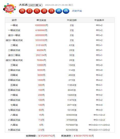 大乐透第2024031期奖号为:09、12、15、30、34+05 06,其中前区奇偶比为2:3,大小比为2:3,和值为100,后区和值为11,跨度为1。