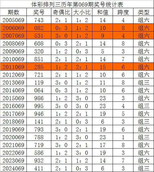 排列三第2024069期奖号为411,奇偶比为2:1,大小比为0:3,和值为6,跨度为3。