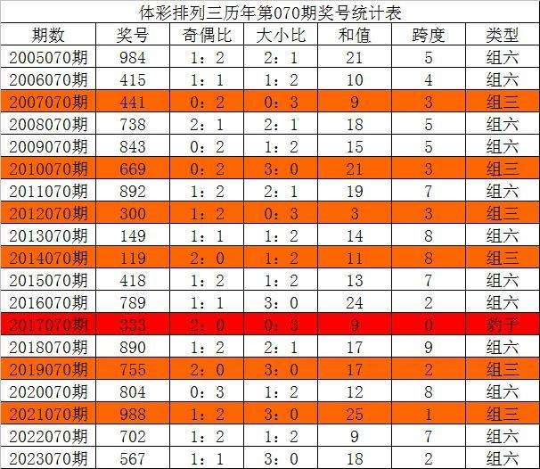 体彩排列三历年第070期开出奖号分别为:984、415、441、738、843、669、892、300、149、119、418、789、333、890、755、804、988、702、567。统计详见下表: