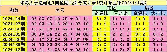 体彩大乐透上周星期六(第2024142期)奖号为08 21 24 33 34 + 03 10,其中前区奖号奇偶比为2:3,三区比为1:2:2,后区奖号奇偶比为1:1,大小比为1:1。