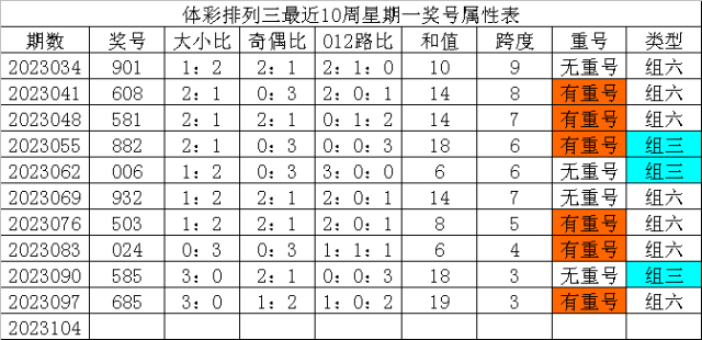 体彩排列三最近10周星期一奖号分别为:901、608、581、882、006、932、503、024、585、685,各奖号属性详见下表: