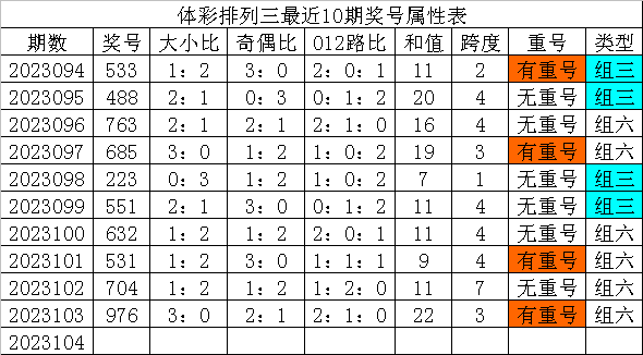 体彩排列三最近10期分别开出奖号:533、488、763、685、223、551、632、531、704、976,各奖号属性详见下表: