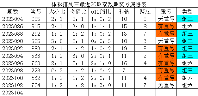 体彩排列三最近20期双数期奖号分别为:055、915、292、585、883、533、763、223、632、704,各期奖号详细属性下表: