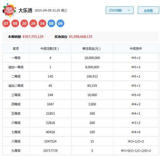 大乐透第2025038期开出奖号为:07、08、20、26、34+08、09。其中前区奇偶比为1:4,三区比为2:1:2,大小比为3:2,后区开出一奇一偶组合。