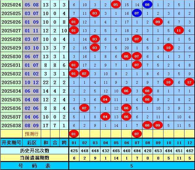 前区第一位推荐:在连续5期开奖中分别出号:04、22、04、05、07,均值为8。4,其中奇数奖号表现较冷,本期适当关注回补,参考奇数号码05。