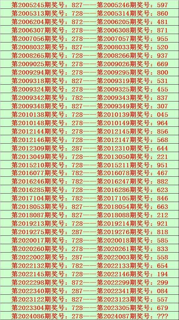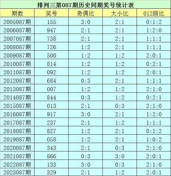 排列三第2024087期开奖日期:2024年4月6日,历史上第087期已开出了19次奖号,历年同期号码分别为:155、947、738、726、500、814、092、684、007、844、013、917、237、827、058、343、866、133、329。