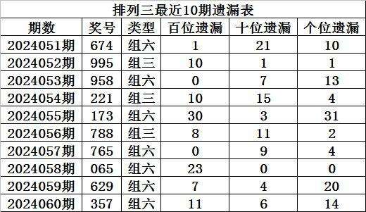 上期回顾:排列三第2024060期奖号:357,组六,直选遗漏总值为31期。