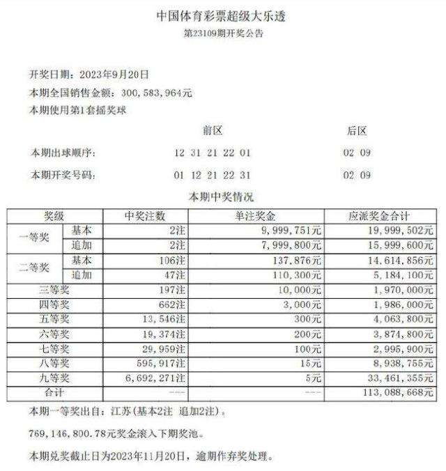北京时间9月20日晚,体彩大乐透第23109期开奖,当期开奖号码为:前区01 12 21 22 31,后区02 09。